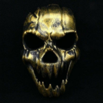 This skull-design mask features a striking gold finish. Its three-dimensional skull shape combined with a vintage gold texture creates a look that is both luxurious and eerie at the same time.