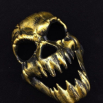 강렬한 골드 컬러로 마감된 해골 디자인 가면입니다. 입체적인 해골 형태와 빈티지한 금색 질감이 어우러져 고급스러우면서도 공포 분위기를 동시에 연출해 줍니다.