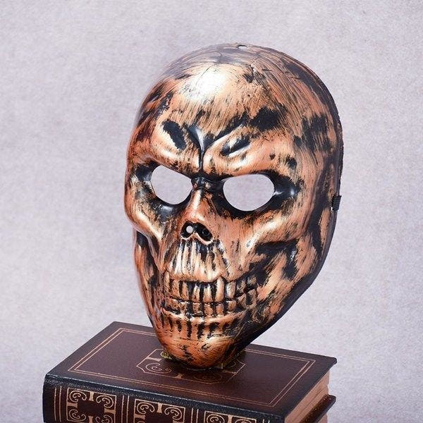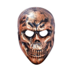 강렬한 동색(브론즈) 컬러로 마감된 해골 디자인 가면입니다. 입체적인 해골 형태와 빈티지한 색감이 어우러져 럭셔리하면서도 공포스러운 분위기를 동시에 연출해 줍니다.
