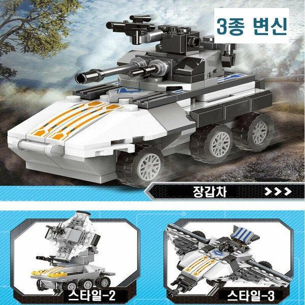 전차, 비행기, 군함 등 다양한 형태로 조립할 수 있어 하나의 세트로 여러 가지 놀이를 즐길 수 있으며, 조립 방식을 바꿀 때마다 새로운 완성품을 만들어보는 재미를 느낄 수 있습니다.